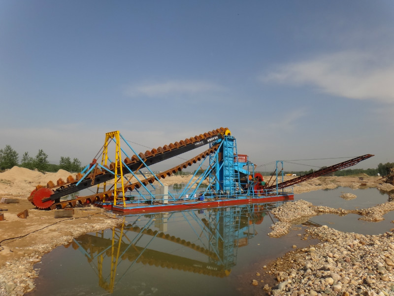 鏈斗式挖沙水洗船的船體使用拼裝式箱型結(jié)構(gòu),在配有挖掘裝置、篩選裝置、提升裝置、傳送裝置等裝置。鏈斗式挖沙船利用電機驅(qū)動挖斗上料。鏈斗式挖沙水洗船在實現(xiàn)河沙的挖掘水洗篩分的過程之后,可以通過揚沙泵或者輸送帶將河沙輸送到岸上。