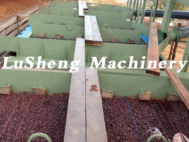 小于8mm的物料經螺旋輸送機輸送至料倉與細碎后的物料混合。料倉下設置自動給料裝置,將物料均勻給入往復式循環溜槽,往復式循環溜槽作為重選流程的設備,其作用就是將錫石和廢石分離,取得高純度的錫石,拋棄不含錫的廢石,達到選礦提純的目的。該設備自動排礦精礦則直接進入精礦池。尾礦自動排棄。選鉭鈮礦設備